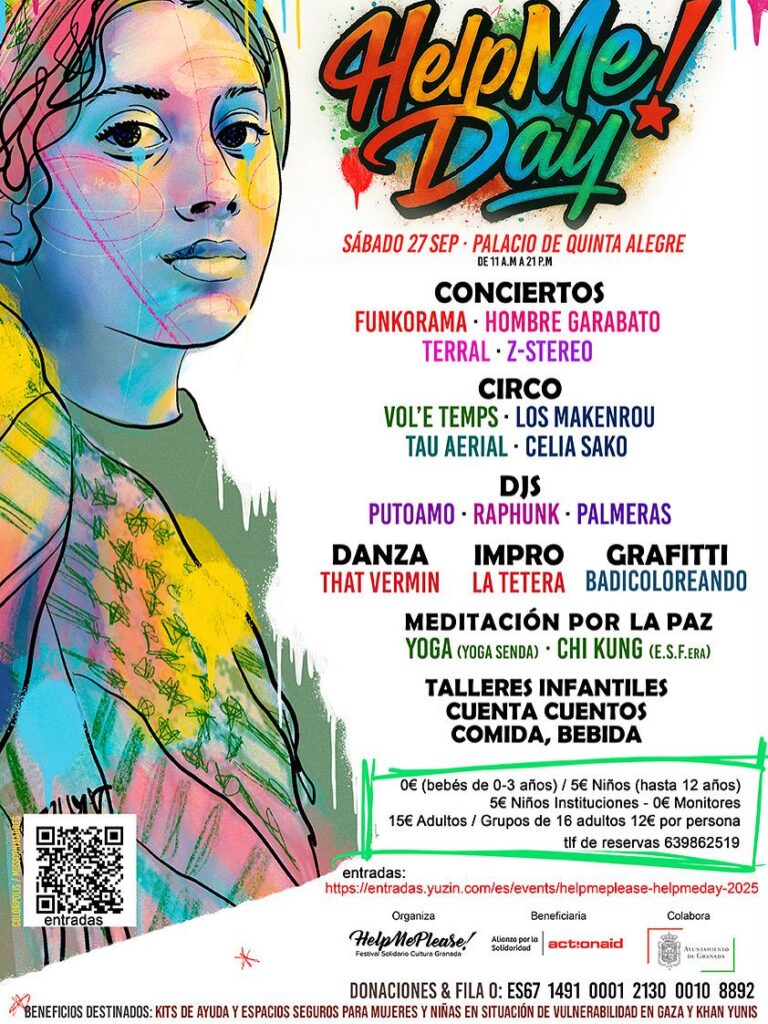 La VIII edición del Festival Solidario Cultura Granada de HelpMePlease! «Semillas de esperanza en tiempos de Guerra – Gaza» celebramos nuestra cita anual con el HelpMeDay! en el Palacio Quinta Alegre (Granada).